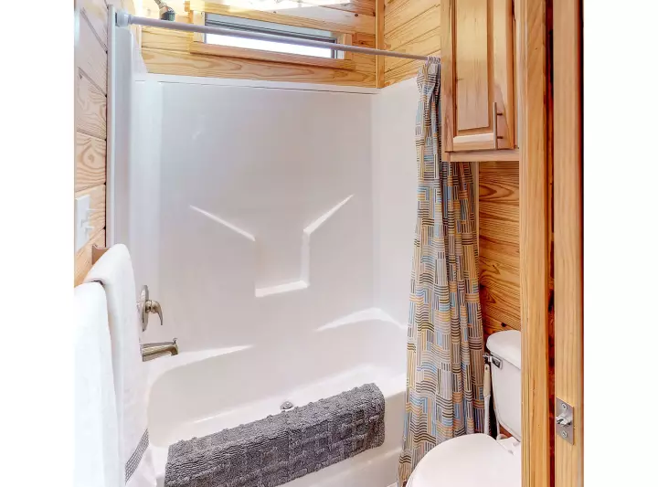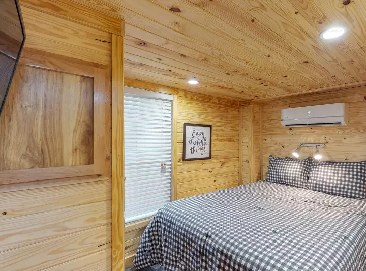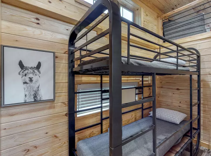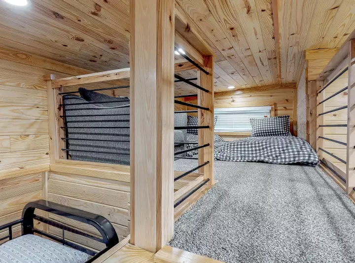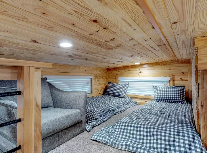 This park model RV features 399 square feet of living space, plus a bunk room and a 6ft porch.