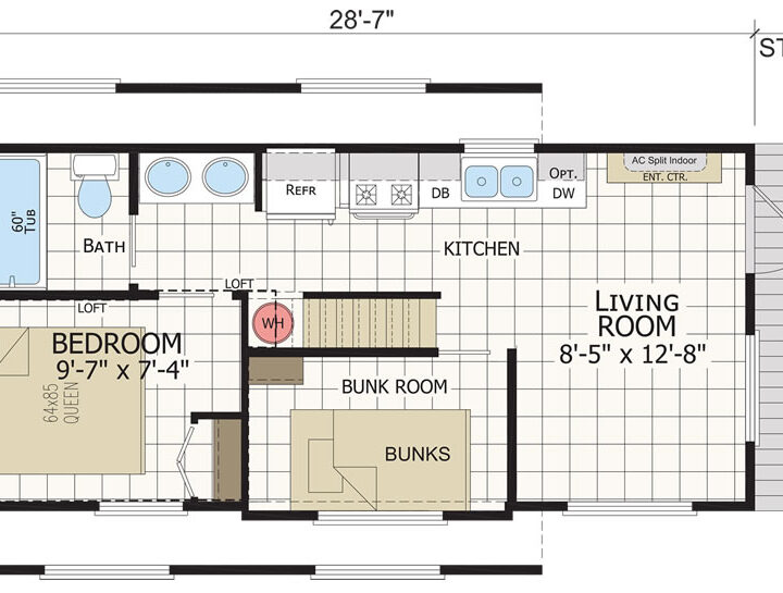 399 Square Feet, 1 Bedroom, 1 Bathroom, Bunk Room and 6 foot porch. This Park Model RV is built to the ANSI code.