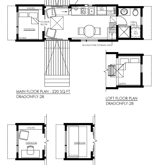 Exterior features of this tiny house model include drop down decks and a fascinating, one-of-a-kind roof design. It is a 220-square-foot luxury tiny home, and it offers all of the facilities and conveniences you need for living comfortably, no matter where you are.