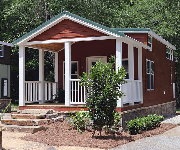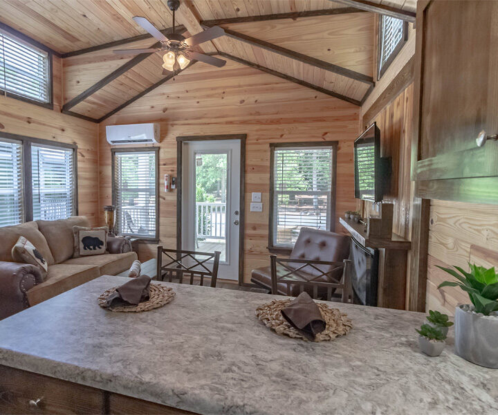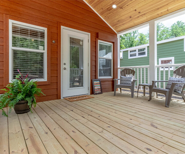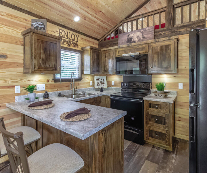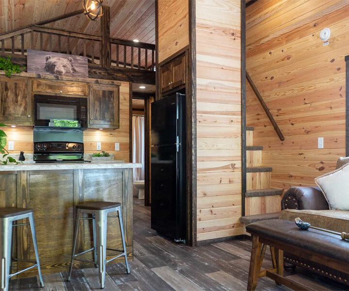 The Horseshoe is one of our most unique tiny home floor plans. This floor plan package features high-end interior finishes, recessed lighting and vaulted ceilings in the living area, creating an inviting atmosphere.